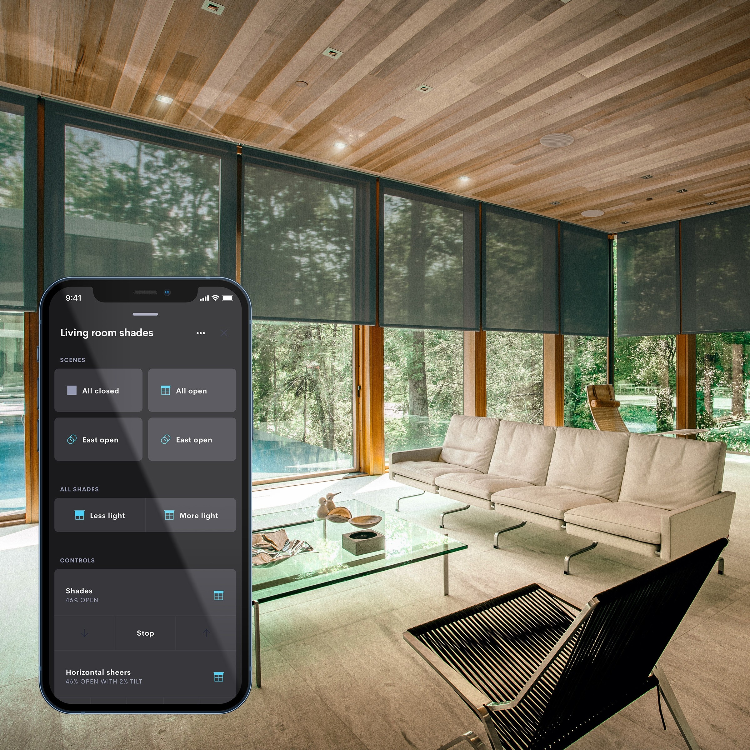 Motorized shading has long carried challenges with cross-manufacturer integration that limits homeowner control. Crestron’s portfolio of shading options changes that by offering a holistic hardware and software ecosystem that goes far beyond the superficial control provided by mismatched systems. At the touch of a button, homeowners can configure, schedule, or execute a shading scene that synchronizes shading throughout the house with other Crestron Home solutions, the Horizon® Thermostat, and third-party extensions to optimize comfort and security.