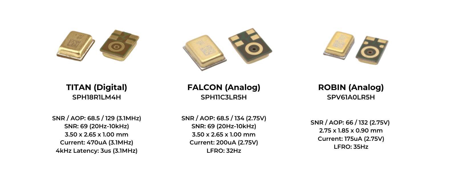 Typical performance of Titan, Robin and Falcon microphones is listed in the attached image. For more information, click here: http://knowles.com/SiSonicTrio.