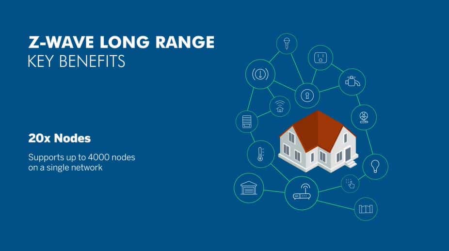 The Z-Wave LR specification supports distances of up to several miles with a maximum output power of 30dBm, while supporting up to 4000 nodes on a single network. This represents a 20x increase over Z-Wave mesh node support while co-existing on the same network as Z-Wave mesh. Z-Wave LR is backwards compatible and maintains interoperability with all Z-Wave certified devices.