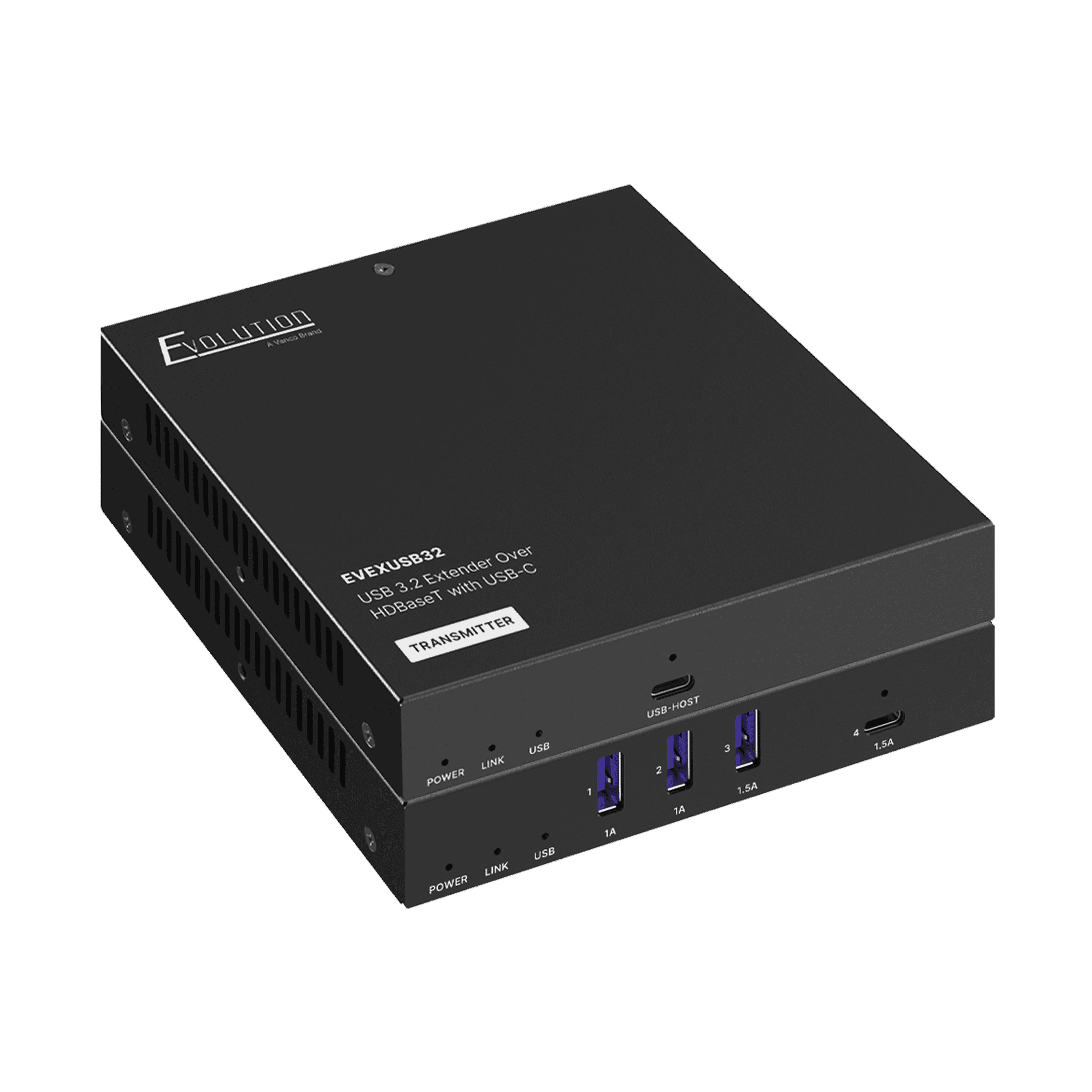 The EVEXUSB32 delivers 1 or 1.5 Amps of power through each receiver port. It supports data transfer speeds up to 5 Gbps and includes RS-232 passthrough and FSYNC, making it ideal for high-performance videoconferencing and multi-camera setups.