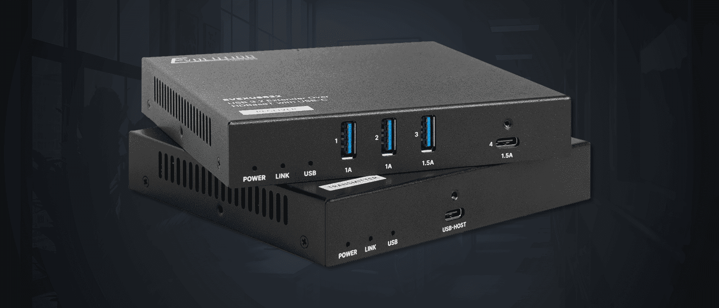 First unveiled at InfoComm 2024, the EVEXUSB32 extends USB 3.2 Gen 1×1 over a single Cat6A cable up to 328 feet (100m) or Cat6 up to 164 feet (50m) using advanced HDBaseT-USB3 chipsets. Compatible with both legacy and modern systems, it features USB-A and USB-C ports to support a variety of devices. The solution includes a host and receiver unit, with PoH functionality requiring only one unit to be externally powered. The host has a single USB-C port, while the receiver offers three USB-A ports and one USB-C port, supporting up to four peripherals.