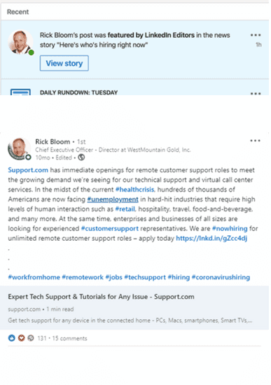 Using strategic social listening and continuous engagement, Caster captured a significant share-of-voice on LinkedIn by mobilizing deliberately curated content and hashtags to capture the attention of LinkedIn editors, who aggregate and recommend trending posts based on interactions and performance. Support.com’s grandfather position in the remote work vertical allowed Caster to guide conversations in #remotework and #workfromhome threads, while its ability to hire workers from anywhere in the world due to its homebased model enabled the brand to get a head start on the fast-growing, wide-reaching #nowhiring and #unemployment trends that boomed in early April.
