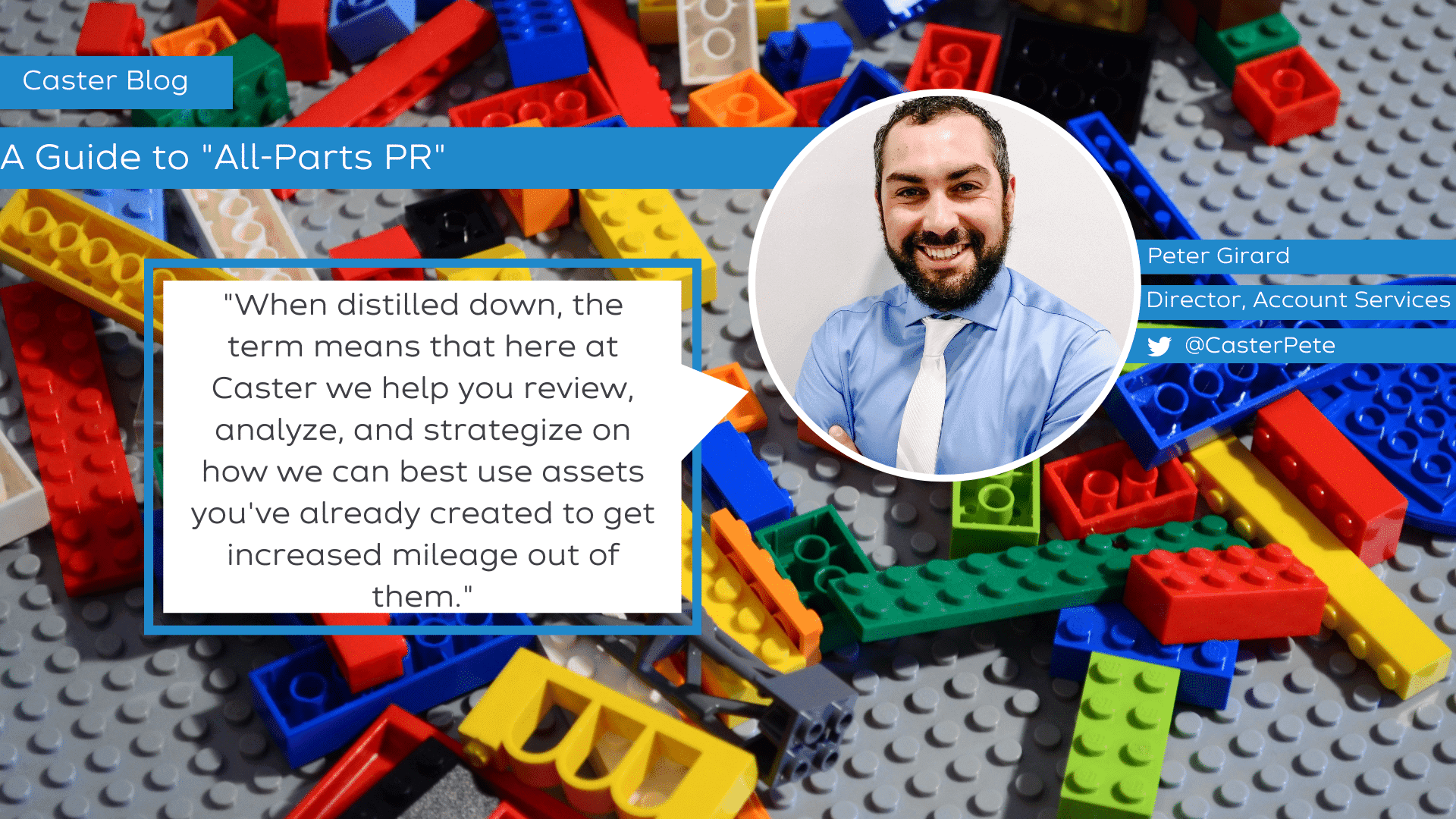 The all-parts PR approach is simple and straightforward. When distilled down, the term means that here at Caster we help you review, analyze, and strategize on how we can best use assets you’ve already created to get increased mileage out of them. We take this approach because, unless the project’s scope is to start from scratch, a client’s time, effort, and money has likely already gone into creating usable assets; they just might not know it yet.