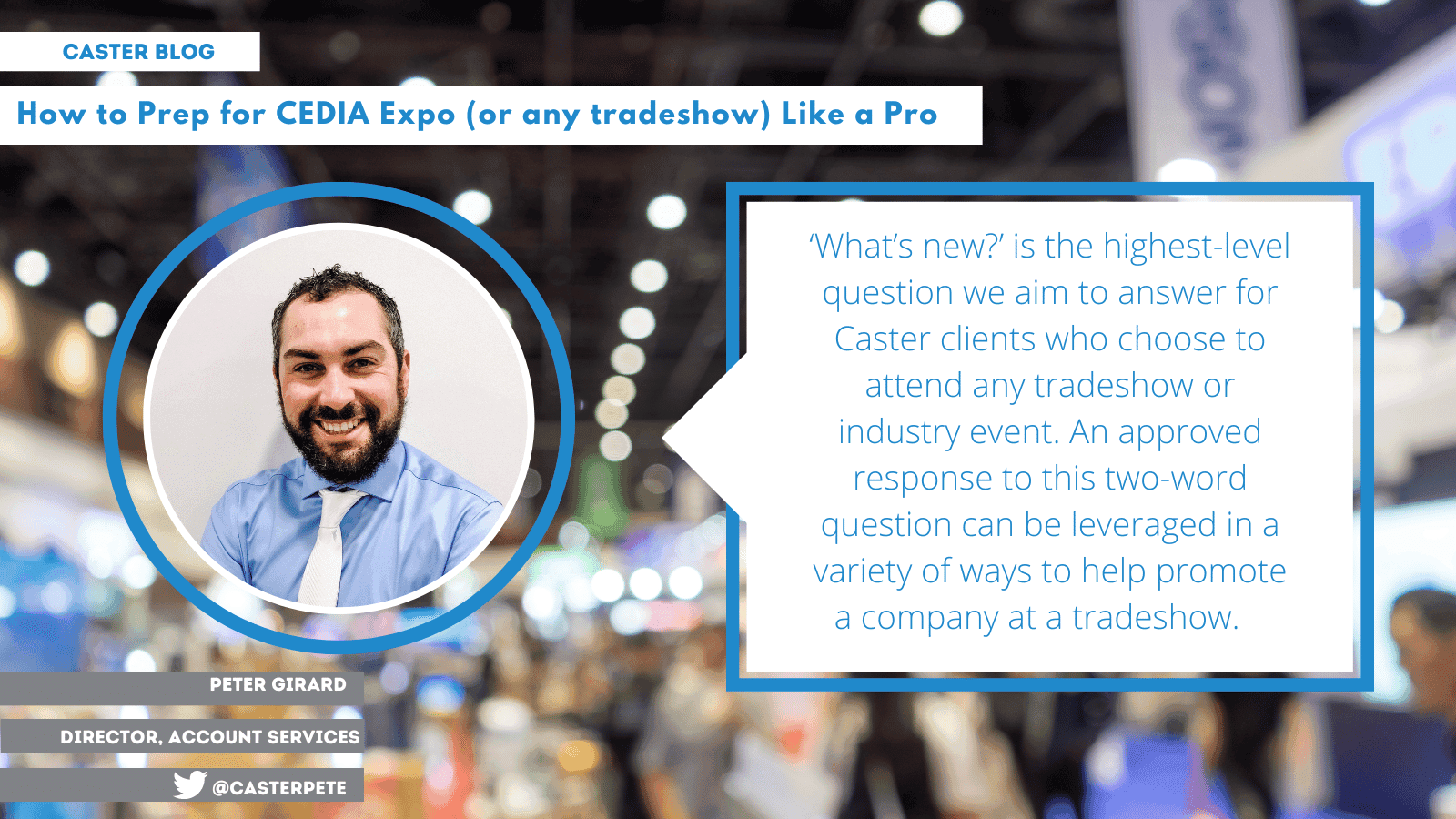 A basic place to start, but fundamental. ‘What’s new?’ is the highest-level question we aim to answer for Caster clients who choose to attend any tradeshow or industry event. The answer must be clear and concise. An approved response to this two-word question can be leveraged in a variety of ways to help promote a company at a tradeshow.